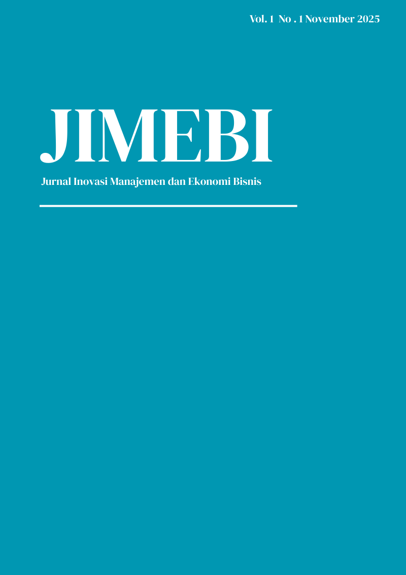 Vol. 2 No. 1 (2026)Jurnal Inovasi Manajemen dan Ekonomi Bisnis (JIMEBI) merupakan jurnal ilmiah yang ditujukan untuk publikasi artikel hasil penelitian di bidang manajemen, ekonomi, bisnis, dan kewirausahaan. Jurnal ini bersifat peer-review dan open access sebagai media publikasi ilmiah yang dapat diakses secara luas oleh masyarakat akademik. Misi Jurnal Inovasi Manajemen dan Ekonomi Bisnis adalah untuk menyebarluaskan, mengembangkan, dan memfasilitasi hasil penelitian di bidang manajemen, ekonomi, dan bisnis, sebagai sarana bagi dosen, guru, peneliti, mahasiswa, dan praktisi dari seluruh Indonesia maupun internasional untuk bertukar informasi terkait hasil penelitian terbaru yang telah dilakukan. Jurnal Inovasi Manajemen dan Ekonomi Bisnis menerima artikel ilmiah yang berkaitan dengan berbagai bidang, termasuk namun tidak terbatas pada Manajemen Pemasaran, Manajemen Keuangan, Manajemen Strategis, Manajemen Operasional, Manajemen Sumber Daya Manusia, E-Business, Knowledge Management, Akuntansi Manajemen, Sistem Pengendalian Manajemen, Sistem Informasi Manajemen, Bisnis Internasional, Ekonomi, Ekonomi Bisnis, Etika Bisnis dan Keberlanjutan, serta Kewirausahaan. Jurnal ini diterbitkan empat kali dalam setahun, yaitu pada bulan Februari, Mei, Agustus, dan November.